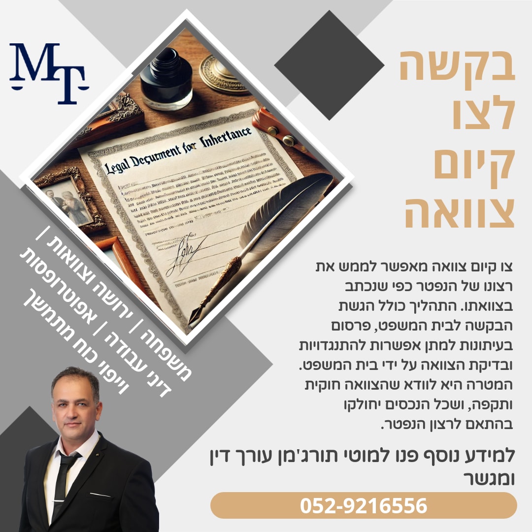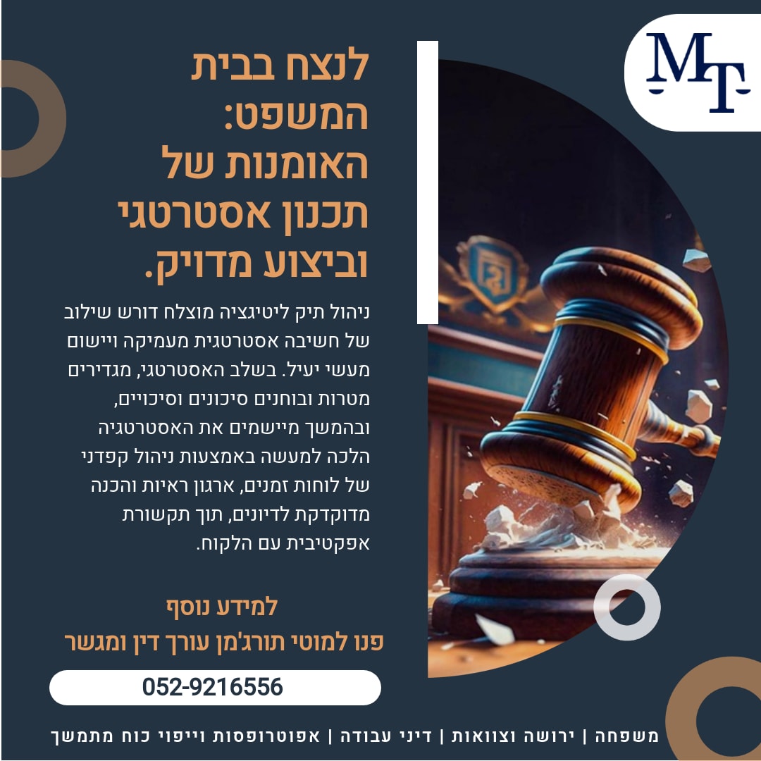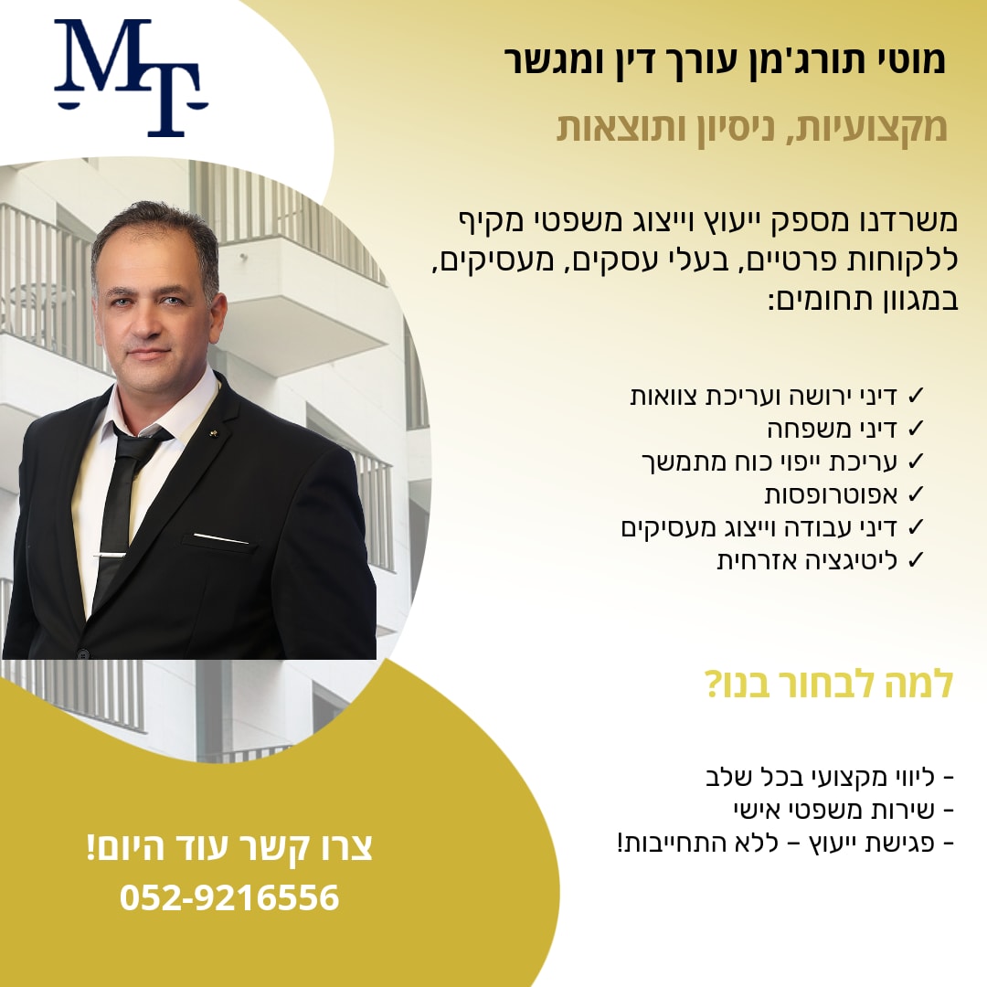 משרד עו"ד ומגשר מוטי תורג'מן -דיני משפחה, ירושה ודיני עבודה משרד עו"ד ומגשר מוטי תורג'מן הוא משרד בוטיק ייחודי המתמחה במתן שירותים משפטיים מדויקים ומעמיקים בתחומי דיני משפחה, צוואות וירושות, ודיני עבודה בישראל. המשרד מייצג לקוחות פרטיים ועסקיים מתוך מחויבות לייצוג משפטי איכותי, ערכי ולוחמני – תוך התאמה אישית מלאה לצרכיו של כל לקוח. עו"ד תורג'מן עוסק מזה שנים בליווי משפטי בתחומים הרגישים ביותר בחיי אדם: ▪️ ייצוג בהליכי גירושין, הסכמי ממון, הסדרי ראייה, ומזונות ▪️ עריכת צוואות, טיפול בהתנגדויות לצו קיום צוואה או צו ירושה ▪️ טיפול בעובדים ומעסיקים בתביעות פיטורים שלא כדין, הפרות חוקי עבודה, וזכויות סוציאליות ▪️ הגישה המשפטית במשרד נשענת על שלושה עקרונות ברזל: - שקיפות מלאה מול הלקוח - מיקוד משפטי מדויק - אסטרטגיה אישית ומותאמת ללקוח עו"ד תורג'מן מלווה את לקוחותיו באופן אישי וצמוד, עם ראייה רחבה, הקשבה אמיתית, והבנה עמוקה של ההיבטים האנושיים והרגשיים הנלווים לכל תיק. כמגשר מוסמך, עו"ד תורג'מן פועל גם לקידום פתרונות מחוץ לכותלי בית המשפט, תוך שמירה על זכויות הלקוח – אך כשנדרש, יודע לעמוד בנחישות ולקדם את טובתו בערכאות המשפטיות. המשרד משתף פעולה עם אנשי מקצוע מובילים – עורכי דין, מגשרים, שמאים ורואי חשבון – כדי לספק מעטפת מלאה ומדויקת לכל לקוח.